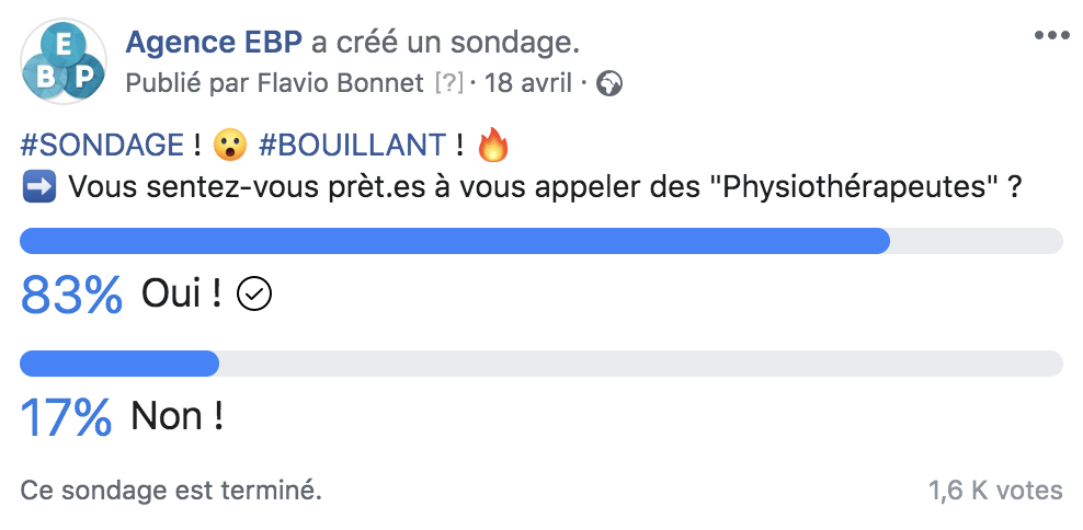 La question était sans détour : « Vous sentez-vous prêts à vous appeler des Physiothérapeutes ? ». Les suggestions de réponses étaient sans alternatives non plus : « oui » ou « non ». Les résultats : sur 1600 votants 83% ont voté « Oui » et 17% ont voté « Non ».
